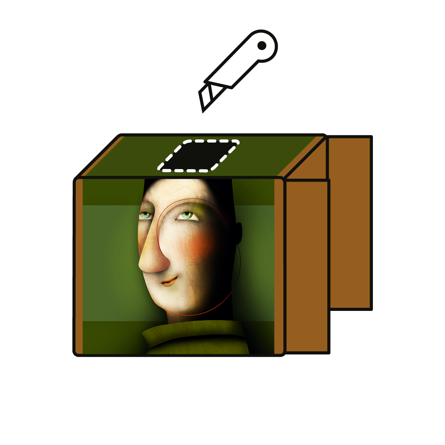 Schneide dann das mit gestrichelter Linie markierte Quadrat auf der Oberseite (bei Hericium: Vorderseite) der Kartonbox aus. Dafür benötigst du ein scharfes Messer.
